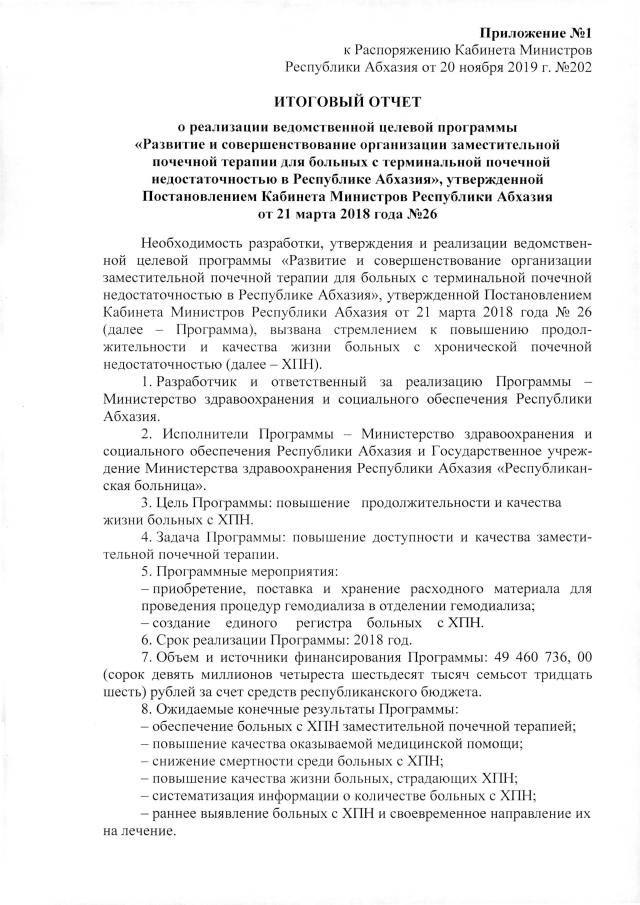 РАСПОРЯЖЕНИЕ Кабинета Министров Республики Абхазия от 20.11.2019 №202 "Об итоговых отчетах о реализации ведомственных целевых программ Министерства здравоохранении и социального обеспечения Республики Абхазии, принятых на 2018 год"