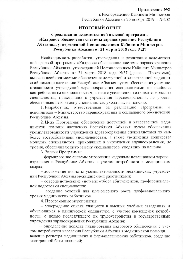 РАСПОРЯЖЕНИЕ Кабинета Министров Республики Абхазия от 20.11.2019 №202 "Об итоговых отчетах о реализации ведомственных целевых программ Министерства здравоохранении и социального обеспечения Республики Абхазии, принятых на 2018 год"