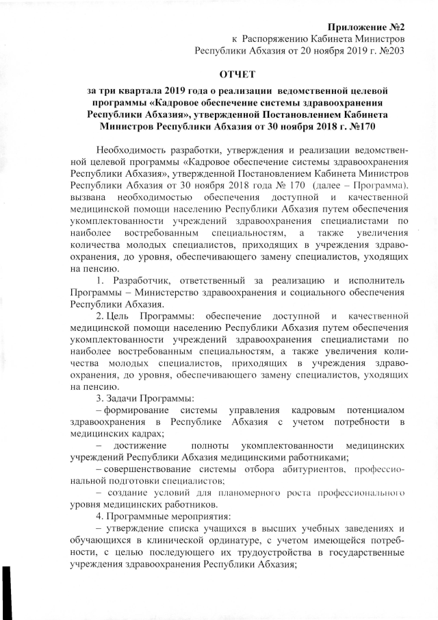 РАСПОРЯЖЕНИЕ Кабинета Министров Республики Абхазия от 20.11.2019 №203 "Об отчетах за три квартала 2019 года о реализации ведомственных целевых программ Министерства здравоохранении и социального обеспечения Республики Абхазии, принятых на 2019 год"