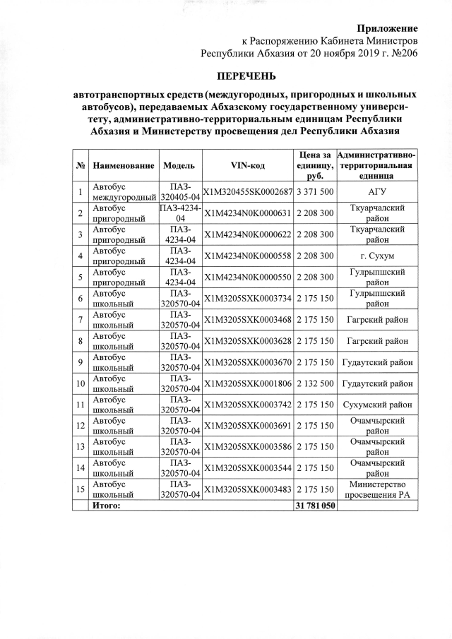 РАСПОРЯЖЕНИЕ Кабинета Министров Республики Абхазия от 20.11.2019 №206 "О передаче Абхазскому государственному университету, административно-территориальным единицам Республики Абхазия и Министерству просвещения Республики Абхазия автотранспортных средств (междугородного, пригородных и школьных автобусов), приобретенных в рамках оказания Российской Федерацией финансовой помощи Республике Абхазия в целях социально-экономического развития в 2019 году"