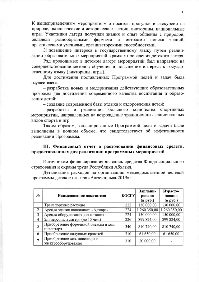 РАСПОРЯЖЕНИЕ Кабинета Министров Республики Абхазия от 20.11.2019 №207 "Об итоговом отчете о реализации межведомственной целевой программы "Детский лагерь "Ажэеипшьаа-2019""