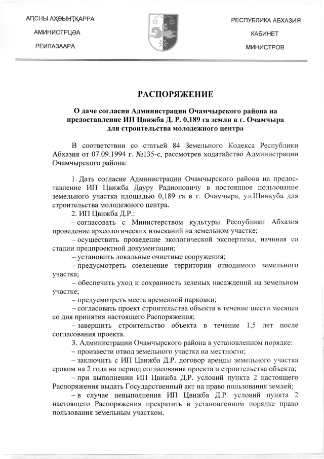 РАСПОРЯЖЕНИЕ Кабинета Министров Республики Абхазия от 20.11.2019 №209 "О даче согласия Администрации Очамчырского района на предоставление ИП Цвижба Д.Р. 0,189 га земли в г. Очамчыра для строительства молодежного центра"