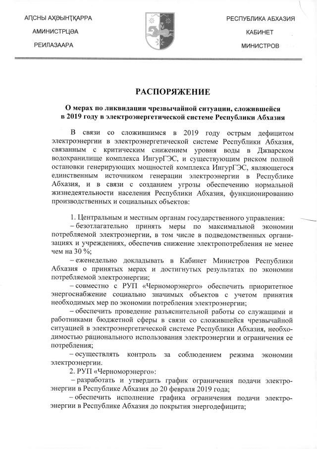 РАСПОРЯЖЕНИЕ Кабинета Министров Республики Абхазия от 19.02.2019 №21 "О мерах по ликвидации чрезвычайной ситуации, сложившейся в 2019 году в электроэнергетической системе Республики Абхазия"