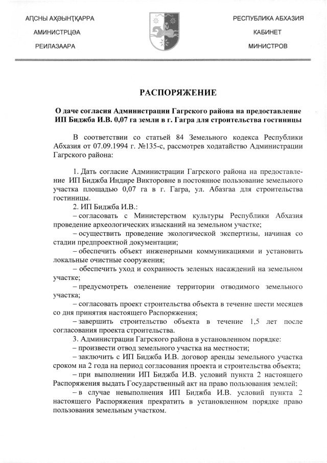 РАСПОРЯЖЕНИЕ Кабинета Министров Республики Абхазия от 20.11.2019 №210 "О даче согласия Администрации Гагрского района на предоставление ИП Биджба И.В. 0,07 га земли в г. Гагра для строительства гостиницы"