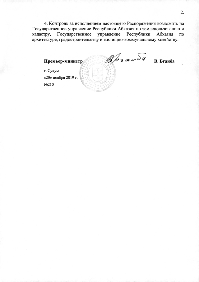 РАСПОРЯЖЕНИЕ Кабинета Министров Республики Абхазия от 20.11.2019 №210 "О даче согласия Администрации Гагрского района на предоставление ИП Биджба И.В. 0,07 га земли в г. Гагра для строительства гостиницы"