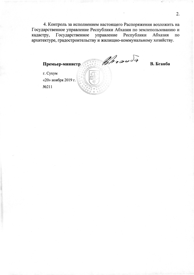 РАСПОРЯЖЕНИЕ Кабинета Министров Республики Абхазия от 20.11.2019 №211 "О даче согласия Администрации Гагрского района на предоставление ИП Хубулову А.В. 0,18 га земли в г. Пицунда для строительства гостиницы"