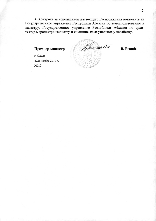 РАСПОРЯЖЕНИЕ Кабинета Министров Республики Абхазия от 22.11.2019 №212 "О даче согласия Администрации Очамчырского района на предоставление ООО "Данат-2015" 0,9 га земли в г. Очамчыра для строительства санаторно-курортного объекта"