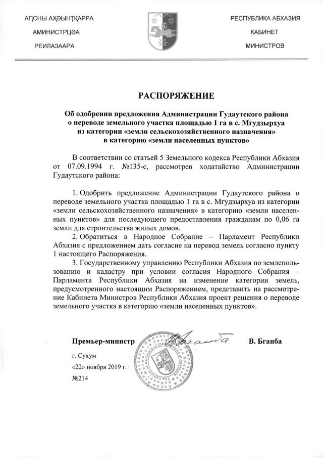 РАСПОРЯЖЕНИЕ Кабинета Министров Республики Абхазия от 22.11.2019 №214 "Об одобрении предложения Администрации Гудаутского района о переводе земельного участка площадью 1 га в с. Мгудзырхуа из категории "земли сельскохозяйственного назначения" в категорию "земли населенных пунктов""
