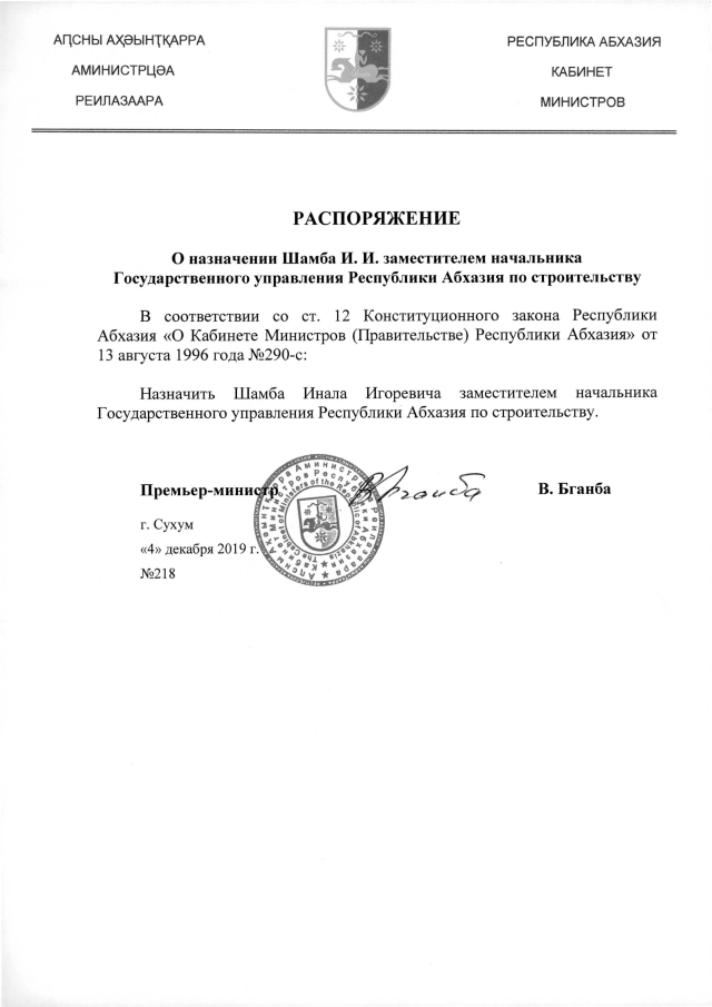РАСПОРЯЖЕНИЕ Кабинета Министров Республики Абхазия от 04.12.2019 №218 "О назначении Шамба И.И. заместителем начальника Государственного управления Республики Абхазия по строительству"