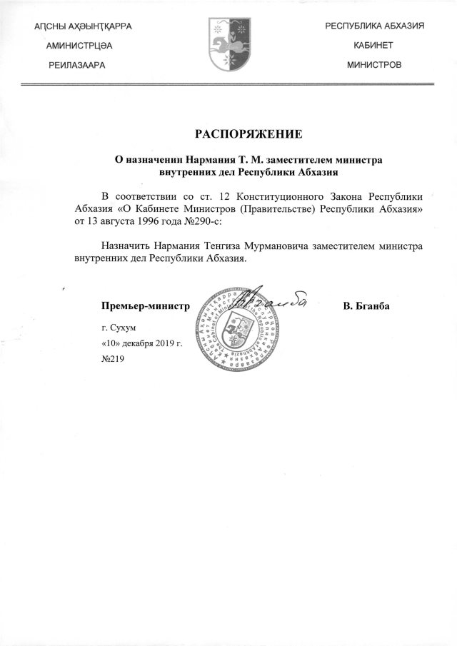 РАСПОРЯЖЕНИЕ Кабинета Министров Республики Абхазия от 10.12.2019 №219 "О назначении Нармания Т.М. заместителем министра внутренних дел Республики Абхазии"