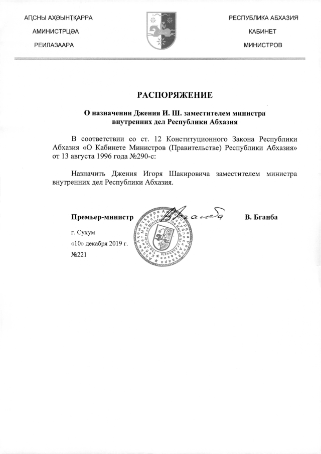 РАСПОРЯЖЕНИЕ Кабинета Министров Республики Абхазия от 10.12.2019 №221 "О назначении Джения И.Ш. заместителем министра внутренних дел Республики Абхазия"