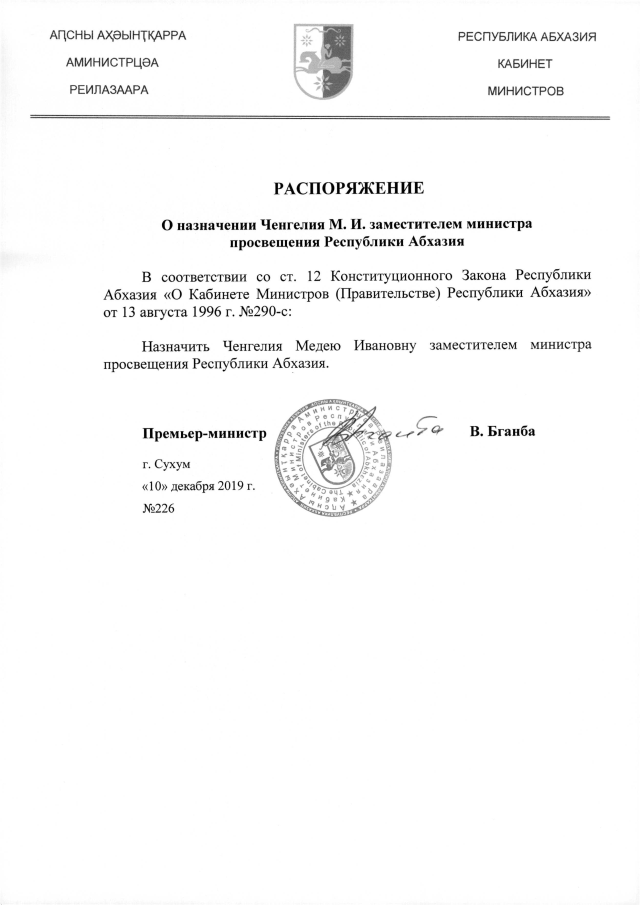 РАСПОРЯЖЕНИЕ Кабинета Министров Республики Абхазия от 10.12.2019 №226 "О назначении Ченгелия М.И. заместителем министра просвещения Республики Абхазия"