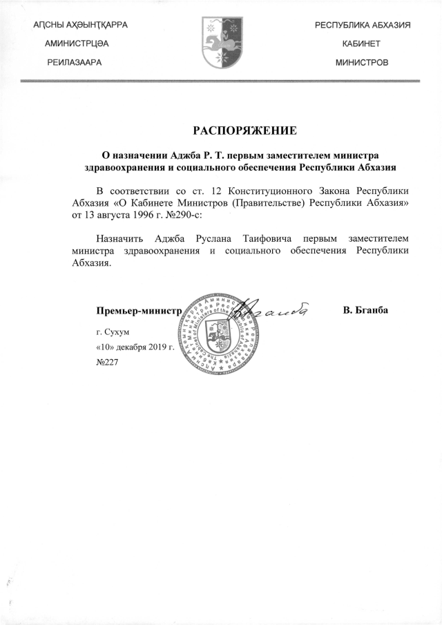 РАСПОРЯЖЕНИЕ Кабинета Министров Республики Абхазия от 10.12.2019 №227 "О назначении Аджба Р.Т. первым заместителем министра здравоохранения и социального обеспечения Республики Абхазия"