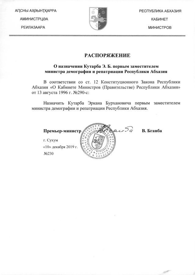РАСПОРЯЖЕНИЕ Кабинета Министров Республики Абхазия от 10.12.2019 №230 "О назначении Кутарба Э.Б. первым заместителем министра демографии и репатриации Республики Абхазия"