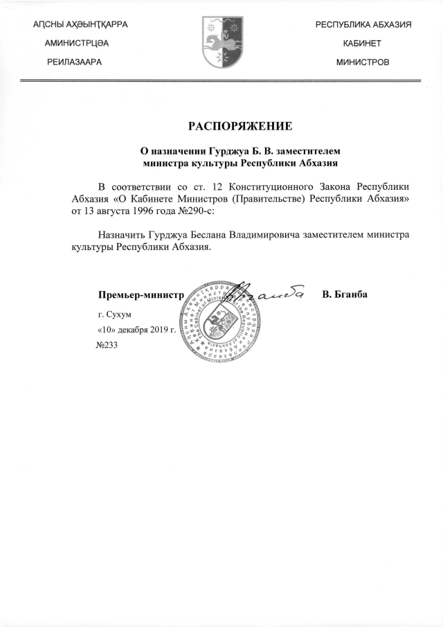 РАСПОРЯЖЕНИЕ Кабинета Министров Республики Абхазия от 10.12.2019 №233 "О назначении Гурджуа Б.В. заместителем министра культуры Республики Абхазии"