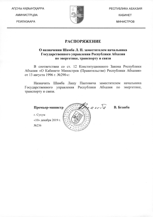 РАСПОРЯЖЕНИЕ Кабинета Министров Республики Абхазия от 10.12.2019 №236 "О назначении Шамба Л.П. заместителем начальника Государственного управления Республики Абхазия по энергетике, транспорту и связи"