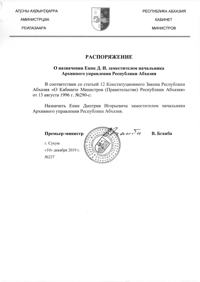 РАСПОРЯЖЕНИЕ Кабинета Министров Республики Абхазия от 10.12.2019 №237 "О назначении Еник Д.И. заместителем начальника Архивного управления Республики Абхазия"