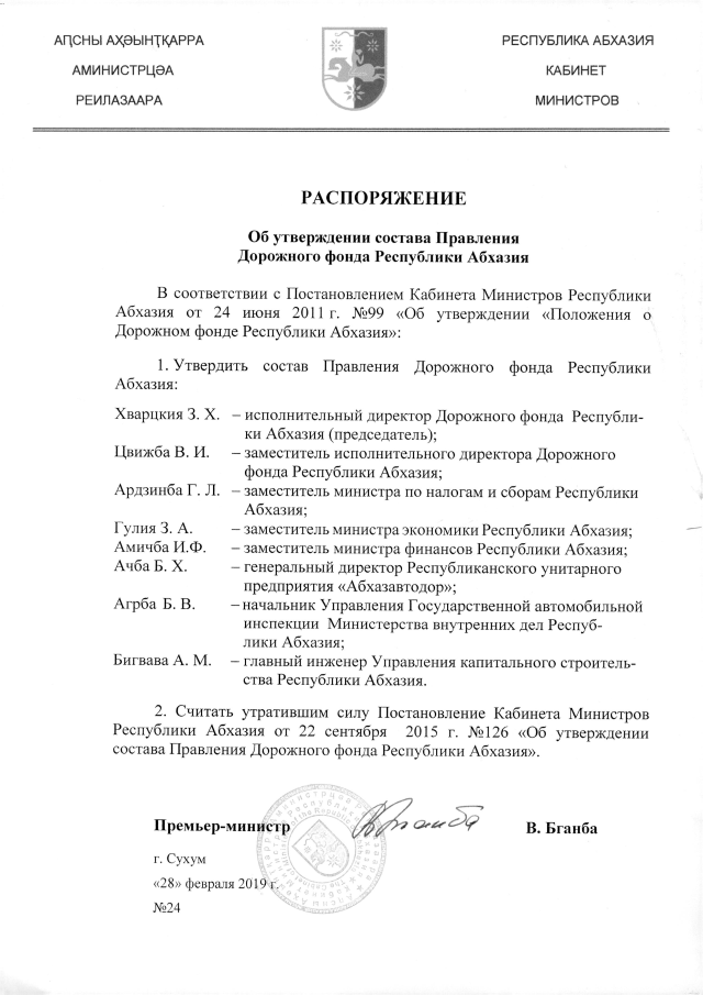 РАСПОРЯЖЕНИЕ Кабинета Министров Республики Абхазия от 28.02.2019 №24 "Об утверждении состава Правления Дорожного фонда Республики Абхазия"