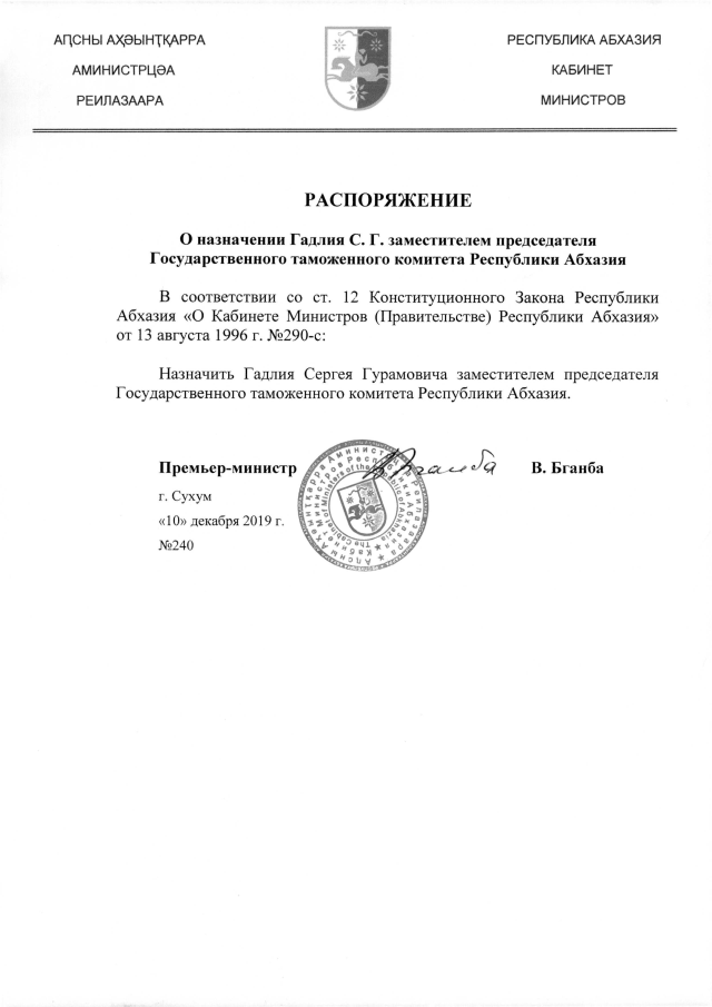РАСПОРЯЖЕНИЕ Кабинета Министров Республики Абхазия от 10.12.2019 №240 "О назначении Галлия С.Г. заместителем председателя Государственного таможенного комитета Республики Абхазия"