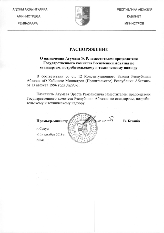 РАСПОРЯЖЕНИЕ Кабинета Министров Республики Абхазия от 10.12.2019 №241 "О назначении Агумава Э.Р. заместителем председателя Государственного комитета Республики Абхазия по стандартам, потребительскому и техническому надзору"