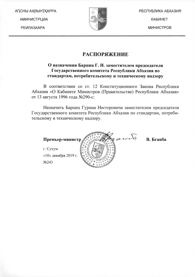 РАСПОРЯЖЕНИЕ Кабинета Министров Республики Абхазия от 10.12.2019 №243 "О назначении Барциц Г.Н. заместителем председателя Государственного комитета Республики Абхазия по стандартам, потребительскому и техническому надзору"