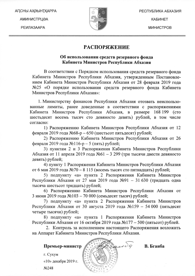 РАСПОРЯЖЕНИЕ Кабинета Министров Республики Абхазия от 10.12.2019 №248 "Об использовании средств резервного фонда Кабинета Министров Республики Абхазия"