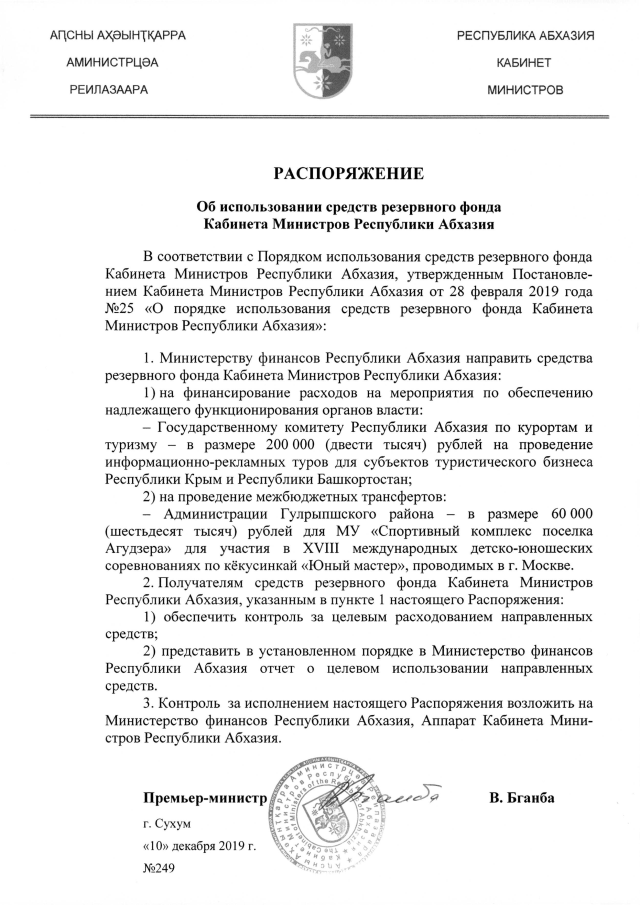 РАСПОРЯЖЕНИЕ Кабинета Министров Республики Абхазия от 10.12.2019 №249 "Об использовании средств резервного фонда Кабинета Министров Республики Абхазия"