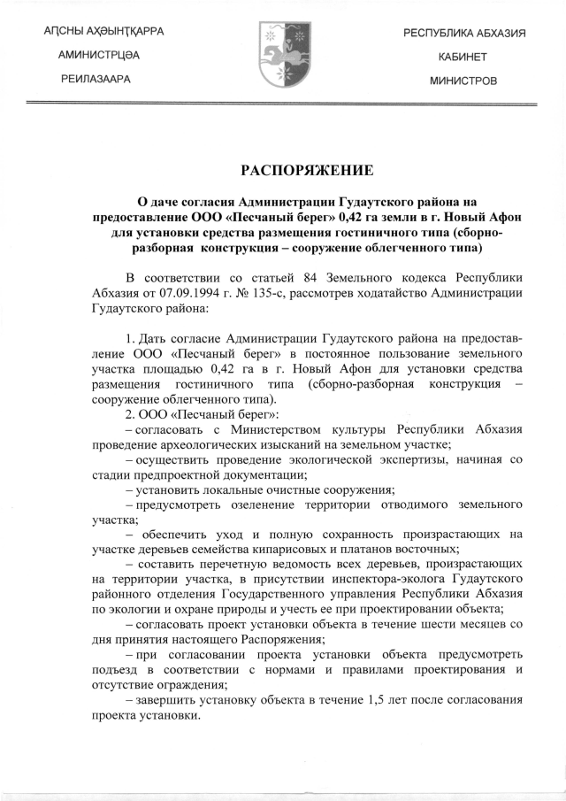 РАСПОРЯЖЕНИЕ Кабинета Министров Республики Абхазия от 10.12.2019 №251 "О даче согласия Администрации Гудаутского района на предоставление ООО "Песчаный берег" 0,42 га земли в г. Новый Афон для установки средства размещения гостиничного типа (сборно-разборная конструкция - сооружение облегченного типа)"
