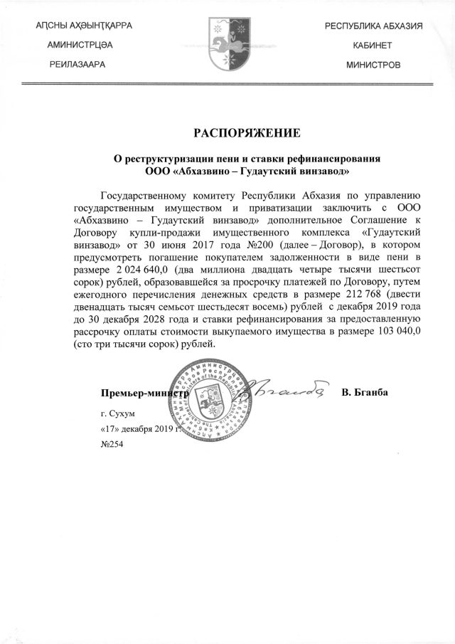 РАСПОРЯЖЕНИЕ Кабинета Министров Республики Абхазия от 17.12.2019 №254 "О реструктуризации пени и ставки рефинансирования ООО "Абхазвино - Гудаутский винзавод""