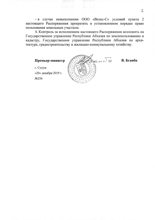 РАСПОРЯЖЕНИЕ Кабинета Министров Республики Абхазия от 20.12.2019 №256 "О переводе земельного участка площадью 0,50 га в с. Бабышира Гулрыпшского района из категории "земли сельскохозяйственного назначения" в категорию "земли рекреационного назначения" для предоставления ООО "Велес-С" в аренду сроком на 25 лет для установки кемпинга"