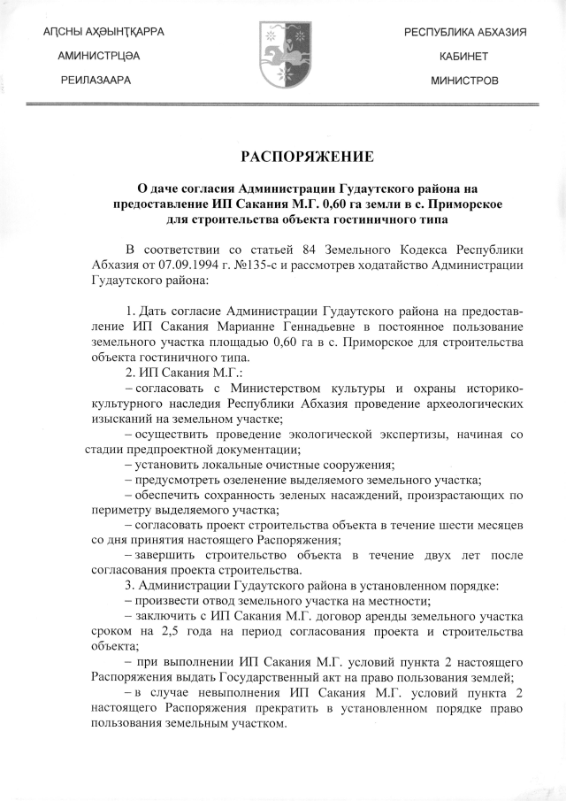 РАСПОРЯЖЕНИЕ Кабинета Министров Республики Абхазия от 28.02.2019 №26 "О даче согласия Администрации Гудаутского района на предоставление ИП Сакания М.Г. 0,60 га земли в с. Приморское для строительства объекта гостиничного типа"