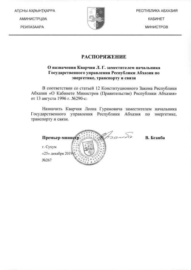 РАСПОРЯЖЕНИЕ Кабинета Министров Республики Абхазия от 25.12.2019 №267 "О назначении Кварчия Л. Г. заместителем начальника Государственного управления Республики Абхазия по энергетике, транспорту и связи"