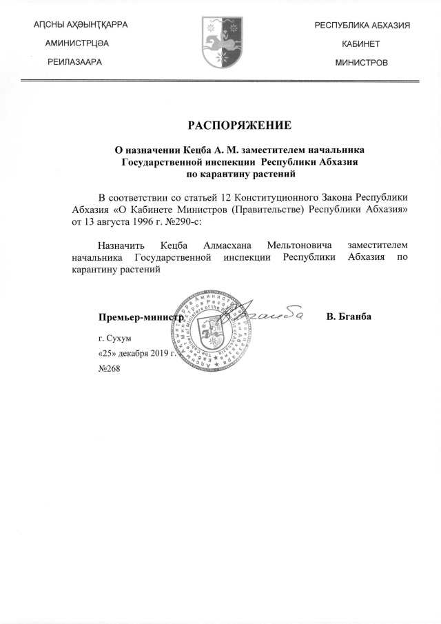 РАСПОРЯЖЕНИЕ Кабинета Министров Республики Абхазия от 25.12.2019 №268 "О назначении Кецба А. М. заместителем начальника Государственной инспекции Республики Абхазия по карантину растений"