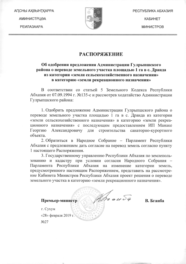 РАСПОРЯЖЕНИЕ Кабинета Министров Республики Абхазия от 28.02.2019 №27 "Об одобрении предложении Администрации Гулрыпшского района о переводе земельного участка площадью 1 га в с. Дранда из категории "земли сельскохозяйственного назначения" в категорию "земли рекреационного назначения""