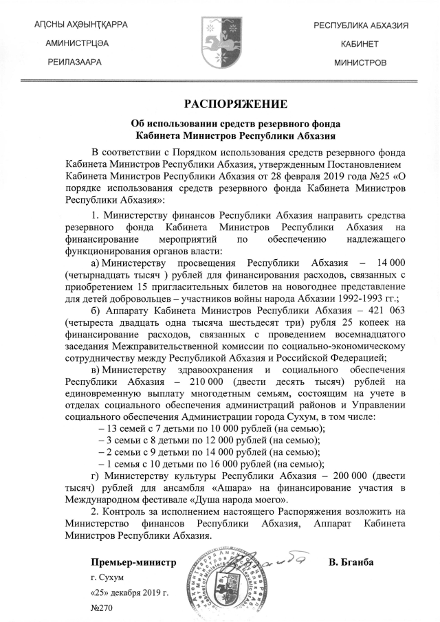 РАСПОРЯЖЕНИЕ Кабинета Министров Республики Абхазия от 25.12.2019 №270 "Об использовании средств резервного фонда Кабинета Министров Республики Абхазия"