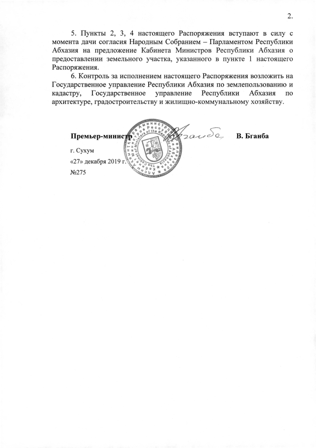 РАСПОРЯЖЕНИЕ Кабинета Министров Республики Абхазия от 27.12.2019 №275 "О предоставлении ООО <Лу-Ка> 0,50 га земли в г. Гагра для строительства гостиницы"