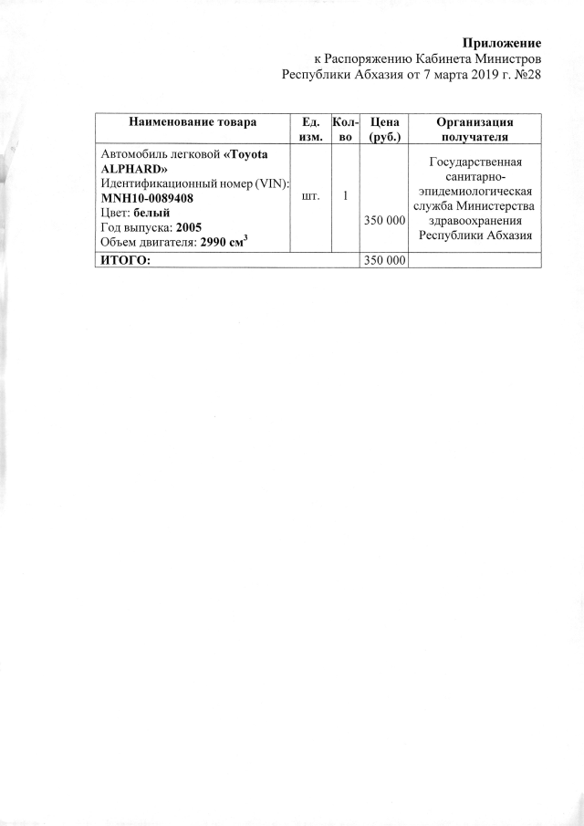 РАСПОРЯЖЕНИЕ Кабинета Министров Республики Абхазия от 07.03.2019 №28 "О централизованном приобретении и распределении автомобиля Аппаратом Кабинета Министров Республики Абхазия"