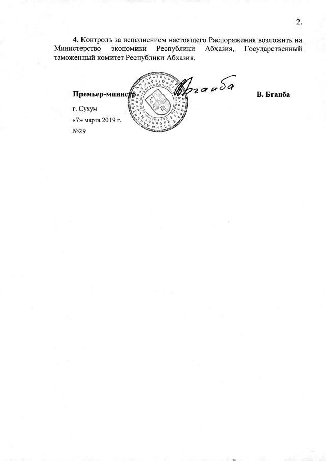 РАСПОРЯЖЕНИЕ Кабинета Министров Республики Абхазия от 07.03.2019 №29 "О разрешении ООО СП "АРС" на ввоз в Республику Абхазия спортивно-тренировочных пистолетов и боеприпасов для служебных целей Министерства обороны Республики Абхазия, Министерства по чрезвычайным ситуациям Республики Абхазия, Государственной миграционной службы Республики Абхазия, Государственной службы охраны Республики Абхазия"