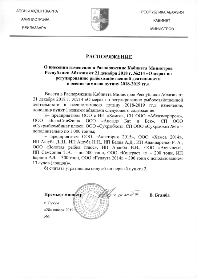 РАСПОРЯЖЕНИЕ Кабинета Министров Республики Абхазия от 28.01.2019 №3 "О внесении изменения в Распоряжение Кабинета Министров Республики Абхазия от 21 декабря 2018 г. №214 "О мерах по регулированию рыбохозяйственной деятельности в осенне-зимнюю путину 2018-2019 гг.""