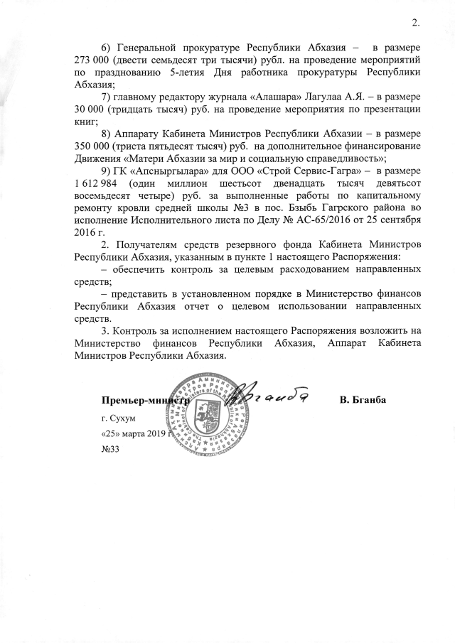 РАСПОРЯЖЕНИЕ Кабинета Министров Республики Абхазия от 25.03.2019 №33 "Об использовании средств резервного фонда Кабинета Министров Республики Абхазия"