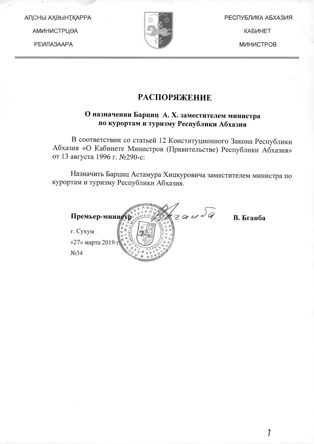 РАСПОРЯЖЕНИЕ Кабинета Министров Республики Абхазия от 27.03.2019 №34 "О назначении Барциц А.X. заместителем министра по курортам и туризму Республики Абхазия"