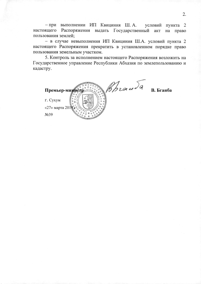 РАСПОРЯЖЕНИЕ Кабинета Министров Республики Абхазия от 27.03.2019 №39 "О даче согласия Администрации г. Сухум на предоставление земельного участка ИП Квициния Ш.А. площадью 0,15 га земли"