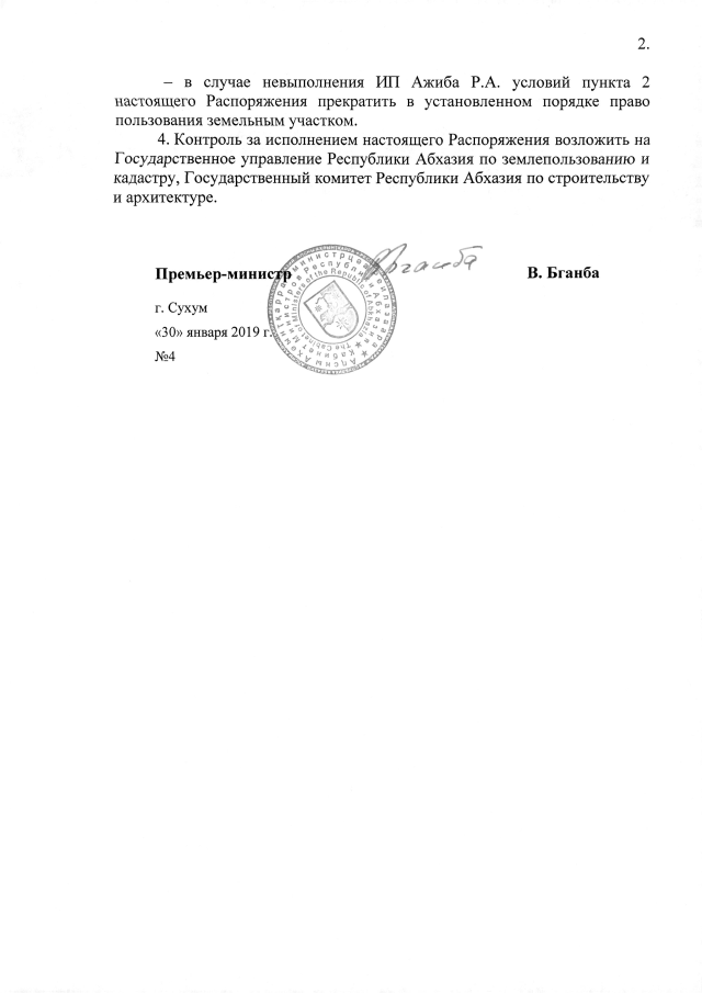 РАСПОРЯЖЕНИЕ Кабинета Министров Республики Абхазия от 30.01.2019 №4 "О даче согласия Администрации Гудаутского района на предоставление ИП Ажиба Р.А. 0,40 га земли в с. Мгудзырхуа для строительства объекта гостиничного типа"
