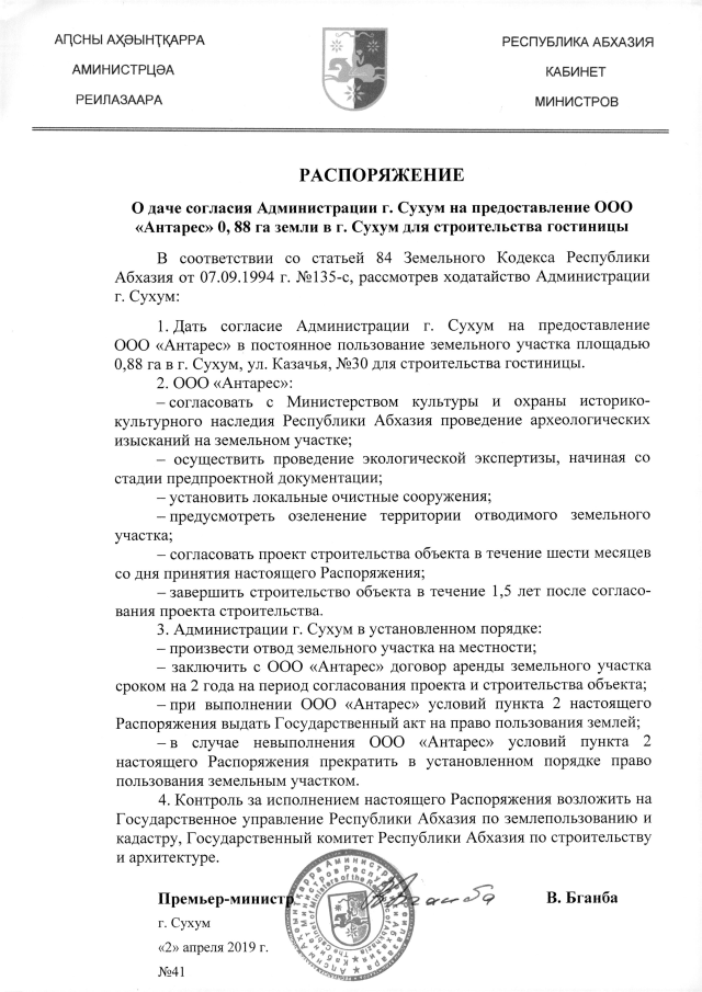 РАСПОРЯЖЕНИЕ Кабинета Министров Республики Абхазия от 02.04.2019 №41 "О даче согласия Администрации г. Сухум на предоставление ООО "Антарес" 0,88 га земли в г. Сухум для строительства гостиницы"