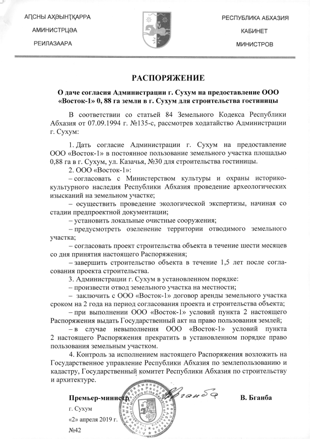 РАСПОРЯЖЕНИЕ Кабинета Министров Республики Абхазия от 02.04.2019 №42 "О даче согласия Администрации г. Сухум на предоставление ООО "Восток-1" 0,88 га земли в г. Сухум для строительства гостиницы"