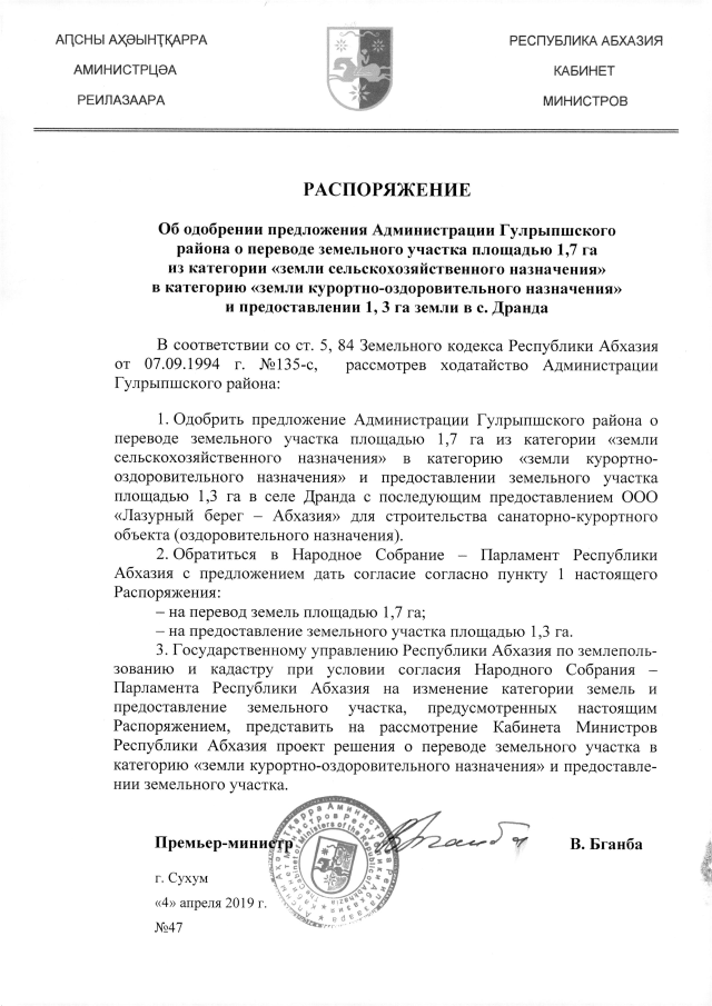 РАСПОРЯЖЕНИЕ Кабинета Министров Республики Абхазия от 04.04.2019 №47 "Об одобрении предложения Администрации Гулрыпшского района о переводе земельного участка площадью 1,7 га из категории "земли сельскохозяйственного назначения" в категорию "земли курортно-оздоровительного назначения" и предоставлении 1,3 га земли в с. Дранда"