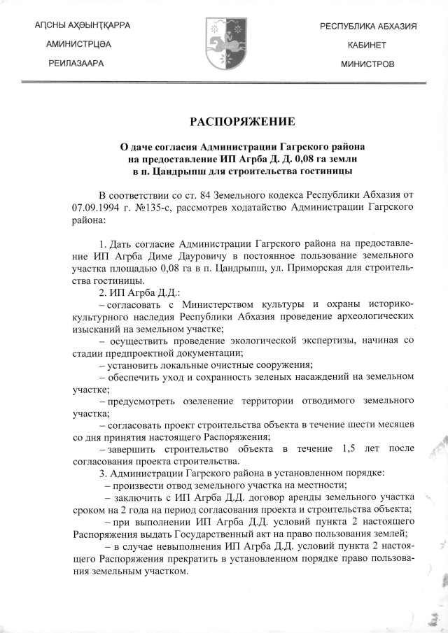 РАСПОРЯЖЕНИЕ Кабинета Министров Республики Абхазия от 04.04.2019 №48 "О даче согласия Администрации Гагрского района на предоставление ИП Агрба Д.Д. 0,08 га земли в п. Цандрыпш для строительства гостиницы"