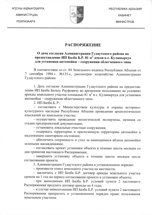 РАСПОРЯЖЕНИЕ Кабинета Министров Республики Абхазия от 04.04.2019 №49 "О даче согласия Администрации Гудаутского района на предоставление ИП Базба Б.Р. 81 м2 земли в с. Куланырхуа для установки автомойки - сооружения облегченного типа"