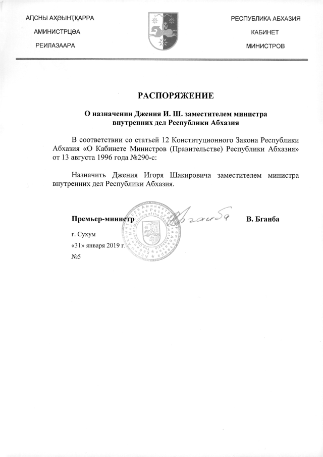 РАСПОРЯЖЕНИЕ Кабинета Министров Республики Абхазия от 31.01.2019 №5 "О назначении Джения И.Ш. заместителем министра внутренних дел Республики Абхазия"