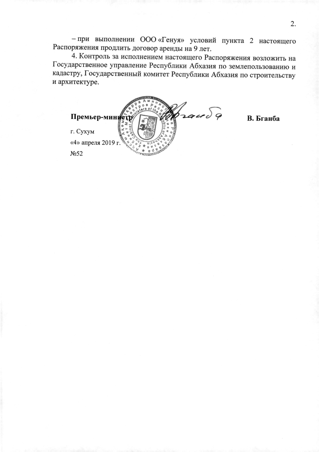 РАСПОРЯЖЕНИЕ Кабинета Министров Республики Абхазия от 04.04.2019 №52 "О даче согласия Администрации г. Сухум на предоставление ООО "Генуя" 105,5 м2 земли для реконструкции объекта общественного питания - строения облегченного типа"